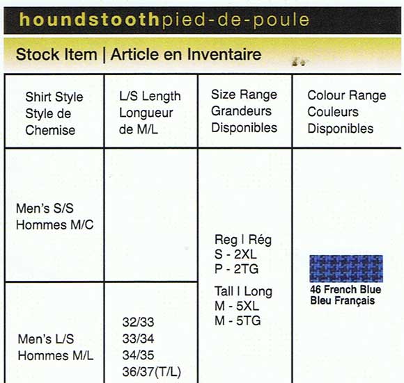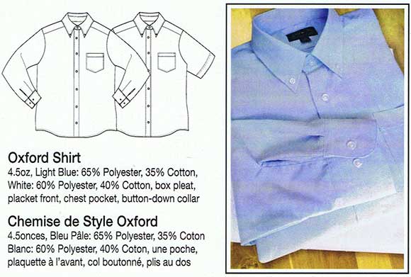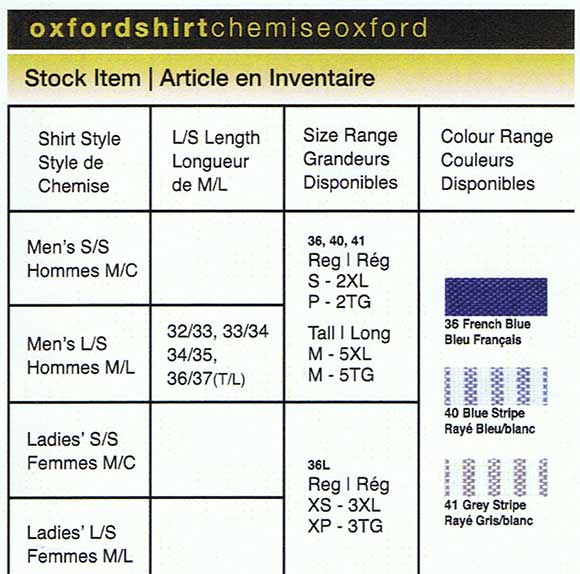 • 65% polyester/35% cotton • stock item • short sleeve available • for men: solid oxford 30, 32, 36 • for ladies with one pocket only: solid oxford 30L, 36L